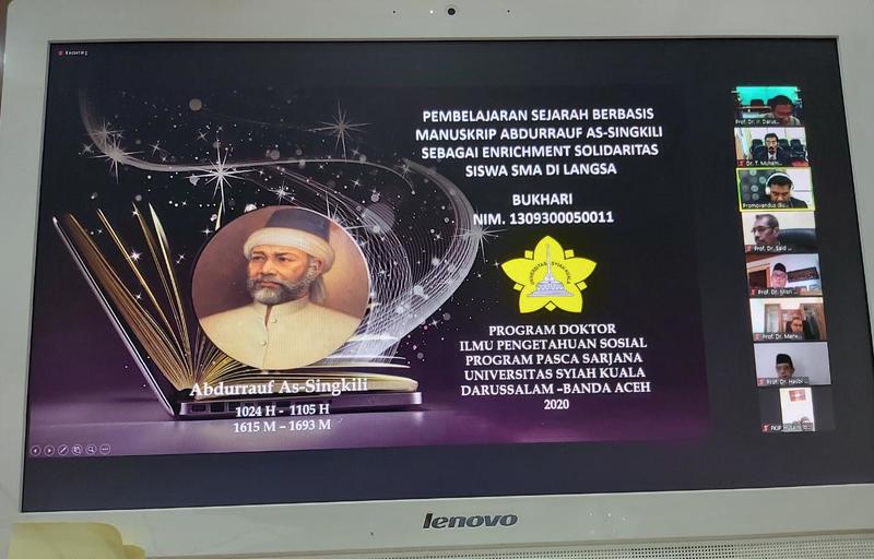 Program Studi Doktor Pendidikan IPS Program Pascasarjana (PPs) Universitas Syiah Kuala menyelenggarakan Sidang Tertutup daring online atas nama Bukhari, pada hari Kamis tanggal 01 Desember 2020 bertempat di Ruang Teleconference Gedung A PPs Universitas Syiah Kuala. Bukhari merupakan mahasiswa program studi Doktor Pendidikan Ilmu Sosial, mempertahankan judul disertasi "Pembelajaran Sejarah Berbasis Manuskrip Abdurrauf As-Singkili Sebagai Enrichment Solidaritas Siswa SMA di Langsa"