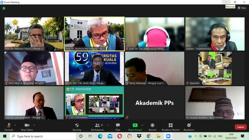 Kamis 18 Maret 2021, Pukul 09.00. WIB Program Studi Doktor (S3) Pendidikan IPS Program Pascasarjana Universitas Syiah Kuala melaksanakan Kegiatan Ujian Promosi Doktor An. ZAILANI. kegiatan ujian Promosi doktor ini diselenggarakan secara virtual Zoom bertempat di Ruang Teleconference PPs Unsyiah.