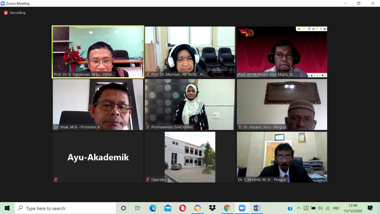 Program Studi Doktor (S3) Ilmu Pendidikan Sosial Program Pascasarjana Universitas Syiah Kuala melaksanakan kegiatan sidang Tertutup doktor , kegiatan ujian Tertutup doktor ini diselenggarakan secara daring dengan menggunakan aplikasi Zoom Meeting, kegiatan diselenggarakan pada hari Selasa, 15 Desember 2020 pukul 09.00 bertempat di Ruang Teleconference PPs Unsyiah.