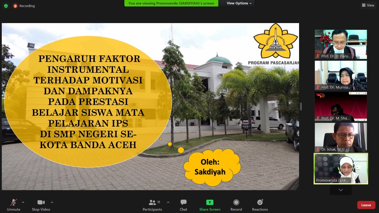 Sakdiyah yang dalam kesehariannya merupakan Dosen di FKIP Jurusan Pendidikan Ekonomi USK. Beliau mempertahankan judul disertasinya “Faktor Instrumental, Motivasi dan Prestasi Belajar SiswaPada Mata Pelajaran IPS di SMP Negeri Se- Kota Banda Aceh.
