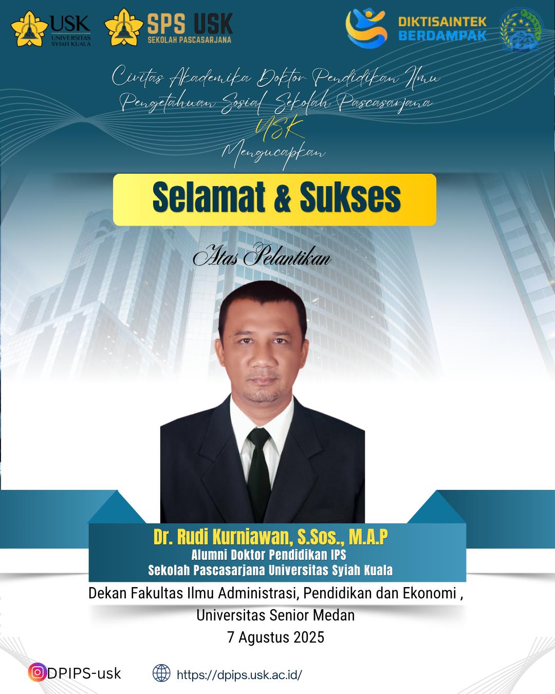 Dengan dilantiknya Dr. Rudi Kurniawan, Prodi S3 Ilmu Pengetahuan Sosial SPS USK menegaskan kembali komitmennya dalam mencetak lulusan yang berintegritas, profesional, serta mampu berperan aktif dalam memajukan pendidikan dan pembangunan bangsa.