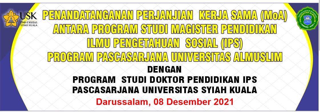 Rabu, 08 Desember 2021 bertempat di Banda AcehProgram Studi Doktor Pendidikan IPS Pascasarjana Universitas Syiah Kuala, tanda tangani Perjanjian Kerjasama (MoA) dengan Program Studi Magister Pendidikan Ilmu Pengetahuan Sosial Program Pascasarjana Universitas Almuslim. PIHAK PERTAMA dan PIHAK KEDUA sepaham dan sepakat bahwa perjanjian kerjasama yang diadakan didasari oleh keinginan untuk saling membantu dan saling menguntungkan dan sepakat bahwa kerjasama ini bertujuan:
