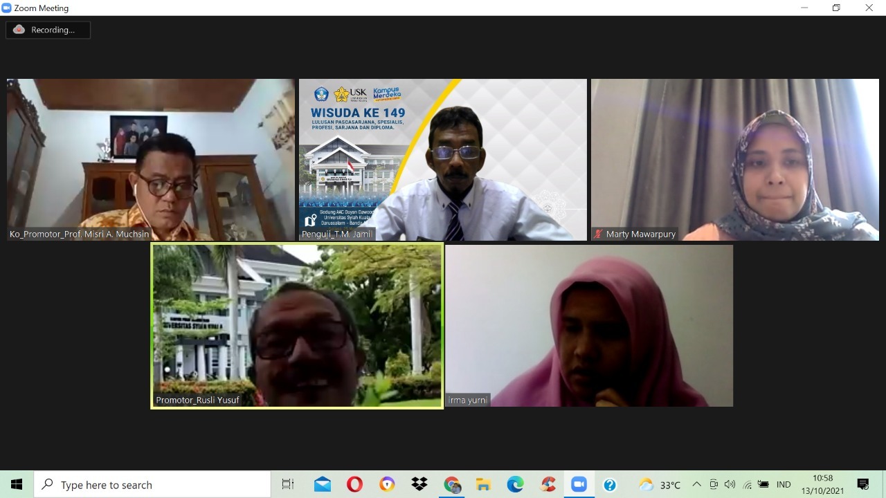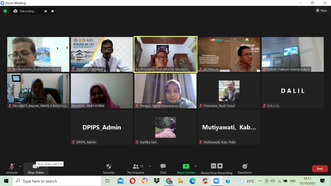 Program Studi Doktor pendidikan IPS Program Pascasarjana USK menyelenggarakan Seminar Proposal An. IRMA YURNI, NPM.1909300050004. Seminar yang berlangsung Pada Rabu, 13 September 2021 Pukul : 09.00 - Selesai, bertempat di Ruang Program Studi Doktor Pendidikan IPS Gedung C PPs USK dan diselenggarakan secara daring dengan menggunakan aplikasi Zoom Meeting.