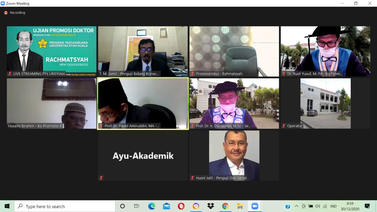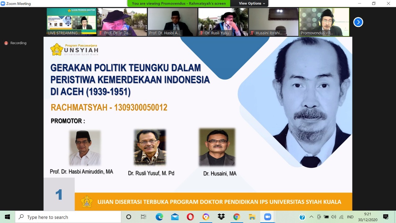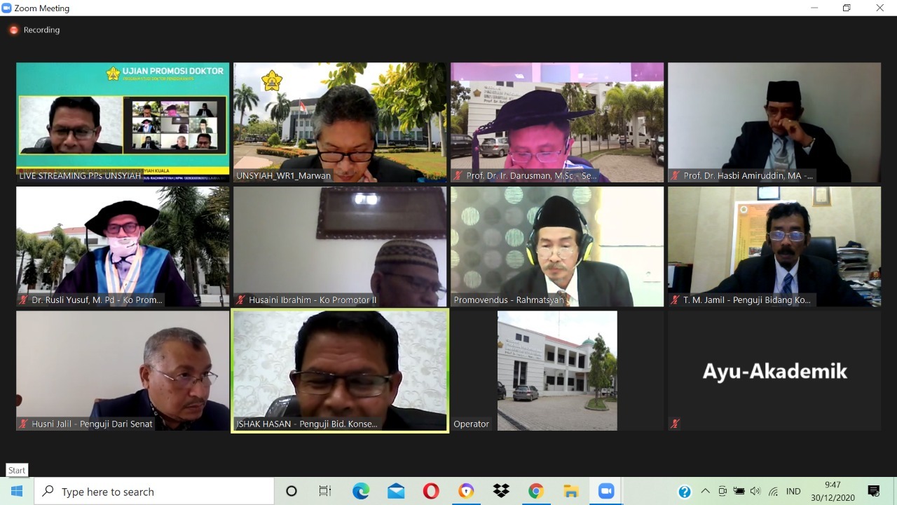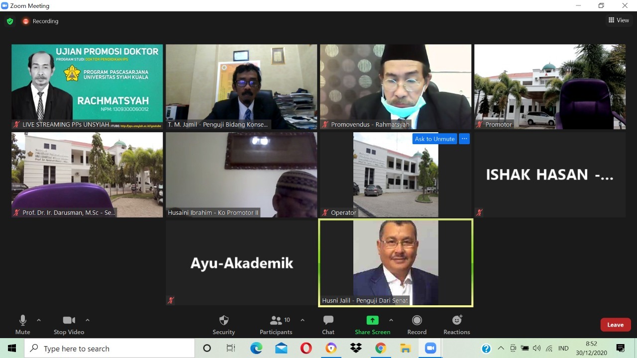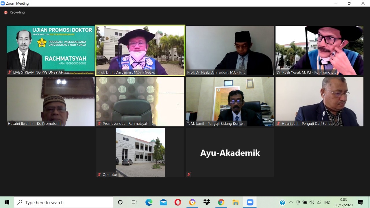 Program Studi Doktor (S3) Ilmu Pendidikan Sosial Program Pascasarjana Universitas Syiah Kuala kembali melaksanakan kegiatan sidang Tertutup doktor , kegiatan ujian Tertutup doktor ini diselenggarakan secara daring dengan menggunakan aplikasi Zoom Meeting, kegiatan diselenggarakan pada hari Rabu, 21 Oktober 2020 pukul 09.00 bertempat di Ruang Teleconference PPs Unsyiah.