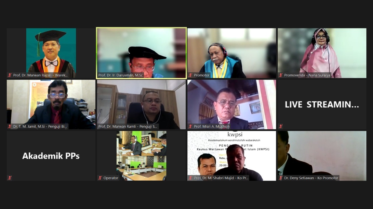 Sidang promosi doktor yang berlangsung secara virtual ini dibuka dan dipimpin langsung oleh Wakil Rektor Bidang Akademik Universitas Syiah KualaProf. Dr. Marwan. dan sekretaris sidang Prof. Dr. Ir. Darusman, M.Sc. (Direktur Program Pascasarjana).;Prof. Dr. Yusrizal, M. Pd, menjabat sebagai promotor; Prof. Dr. M. Shabri A. Majid, SE, M.Ec.,menjabat sebagai Ko-Promotor; Dr. Deny Setiawan, M Si menjabat sebgai Ko-Promotor 2; Dr. Said Musnadi, SE, M. Si., menjabat sebagai Penguji bidang konsentrasi; Dr. T. M. Jamil, M. Si Sebagai Penguji bidang konsentrasi 2; Prof. Dr. Marwan, S. Si., M. Si., menjabat sebagai Penguji Senat Unsyiah; dan Prof. Dr. Misri A. Muchsin, M. Ag., dari UIN Ar-Raniry menjabat sebagai penguji bidang konsentrasi dari luar institusi.